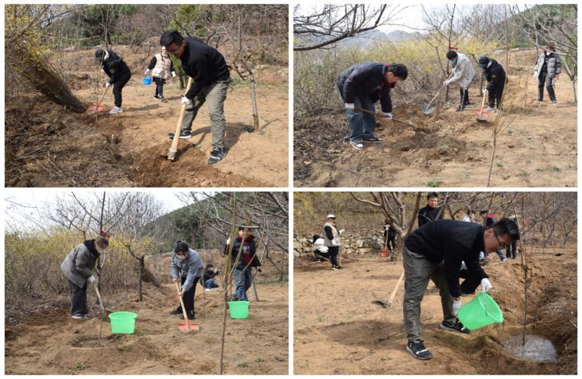 植樹現(xiàn)場,大家揮鍬鏟土、扶苗正苗、填土踩實、提水澆灌,各組團員青年干勁十足、協(xié)作融洽,經(jīng)過一個多小時的努力,一顆顆樹苗在田地里“安家落戶”,也將春天里象征希望的種子深深埋下。