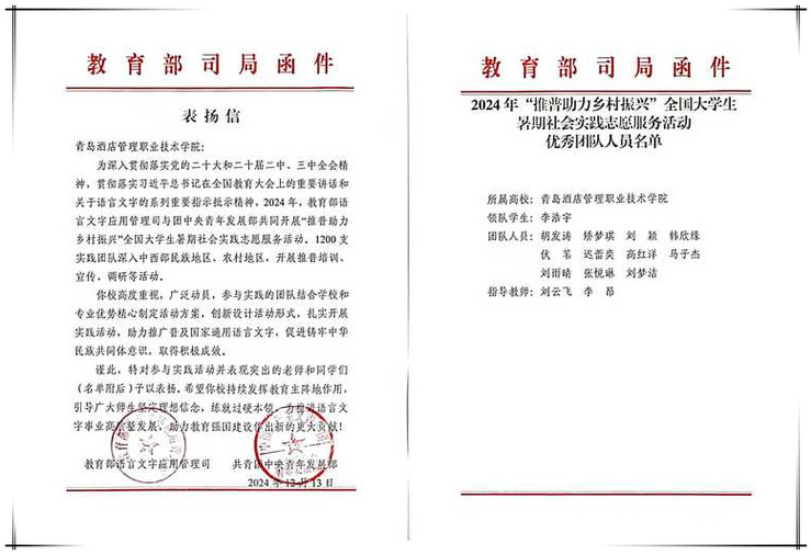 近日,由教育部語言文字應用管理司、共青團中央青年發展部聯合開展的2024年“推普助力鄉村振興”全國大學生暑期社會實踐志愿服務活動評選結果揭曉,青島酒店管理職院下設的文旅學院組織赴新疆哈密“百村計劃”鄉村振興服務隊獲評2024年度“推普助力鄉村振興”優秀團隊,教育部語言文字應用管理司和共青團中央青年發展部來信表揚,對學校社會實踐活動的突出貢獻表示充分肯定。