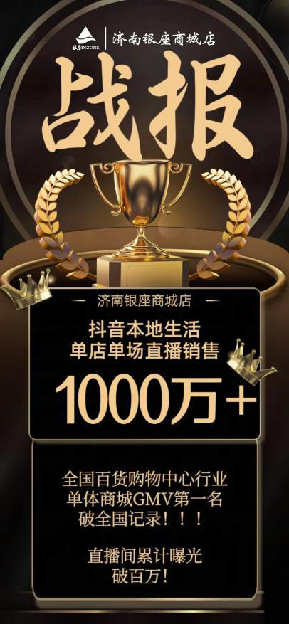 近日,銀座濟南商城店組織開展“27周年慶”抖音本地生活專場團券大型直播活動,直播專場曝光量破百萬,銷售額超1000萬元,破抖音本地生活百貨購物中心行業單店單場直播GMV全國紀錄。