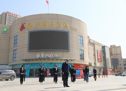銀座濰坊青州店員工及管理人員在主通道莊重站立進(jìn)行默哀活動(dòng)。