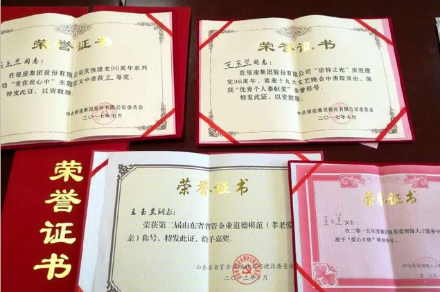 2013年,王玉蘭榮獲了“第二屆山東省省管企業道德模范”(孝老愛親)稱號。能獲得此榮譽,不單單是因為偉大的母愛感動評委,還因為她是左鄰右舍稱贊的孫家好兒媳。1998年7月,72歲的公公因腸癌住進了醫院,因第一次手術不成功造成腸瘺,連續進行了四次大手術,在醫院住了將近一年的時間。