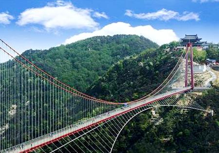據(jù)了解,目前世界上較長的懸索橋有瑞士的歐洲之橋(494米)、德國的“泰坦-RT”步行懸索橋(458米)、俄羅斯的索契天空公園橋(439米)、中國湖南張家界玻璃橋(430米)。而銀座天蒙景區(qū)的人行懸索橋全長505.5米,在被群山環(huán)繞的天蒙景區(qū)里,它橫跨兩座山峰,凌空而起,是連接玉皇宮和望海樓兩個重要景點的交通要道。該人行索橋的建成避免了游客穿過深達143米的婁子溝,節(jié)約40分鐘的行程。