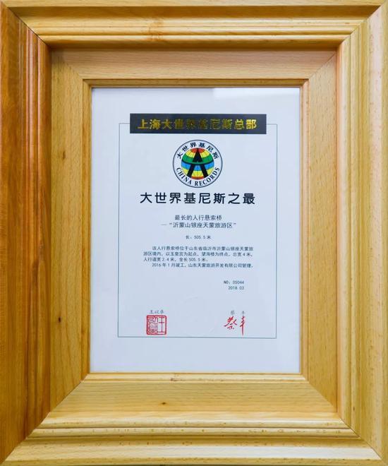 日前,沂蒙山銀座天蒙旅游區(qū)的“網(wǎng)紅景點”——人行懸索橋通過大世界基尼斯總部權(quán)威認證,獲得“大世界基尼斯之最”證書。這標志著天蒙山全長505.5米的人行懸索橋成功入選大世界基尼斯之最,被確認為最長人行懸索橋。
