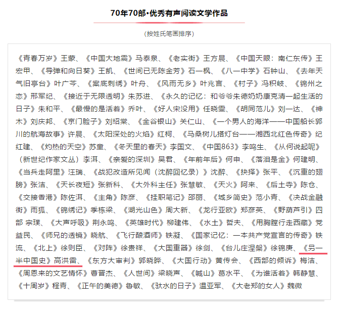 10月30日,由中廣聯(lián)合會有聲閱讀委員會主辦的“中國有聲”——“70年70部·優(yōu)秀有聲閱讀文學(xué)作品”發(fā)布會在北京廣播大廈隆重舉行。中國作家協(xié)會會員,中國自然資源作家協(xié)會副主席,省商業(yè)集團(tuán)有限公司黨委書記、董事長兼省文旅集團(tuán)董事長高洪雷作品《另一半中國史》入選“70年70部·優(yōu)秀有聲閱讀文學(xué)作品”名單。該書由中央廣播電視總臺央廣中國之聲首席主播蘇揚全文演播。
