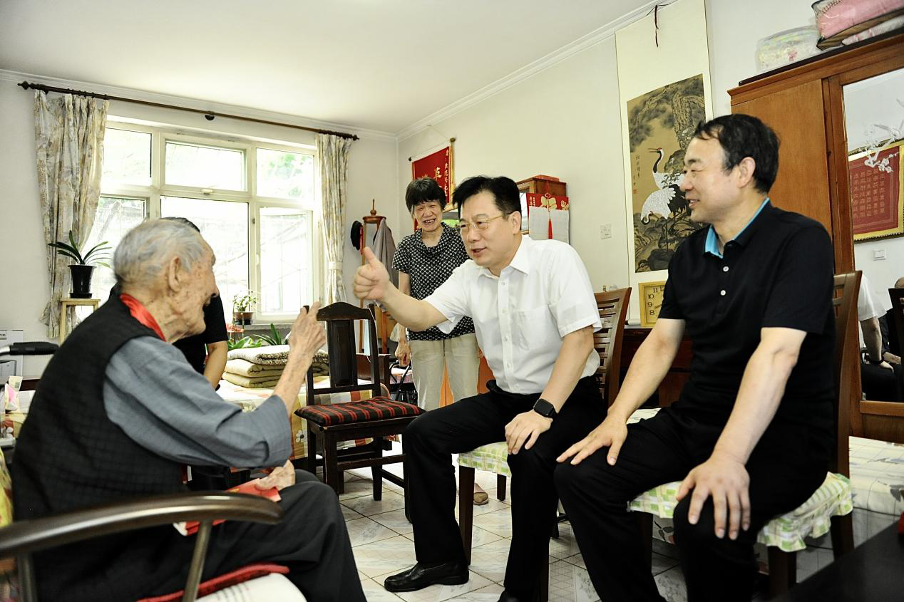 單盛甫老人今年已經105歲高齡,黨齡76年,是山東省國資系統(tǒng)最年長的老黨員。張斌向老人女兒關切地詢問老人的身體健康狀況和生活情況,與老人進行了親切的交流,并祝福老人健康長壽、繼續(xù)“走好長征路”。高洪雷感謝單盛甫老人及集團老同志們對企業(yè)發(fā)展工作的支持,他囑咐老人女兒要照顧好老人的身體。
