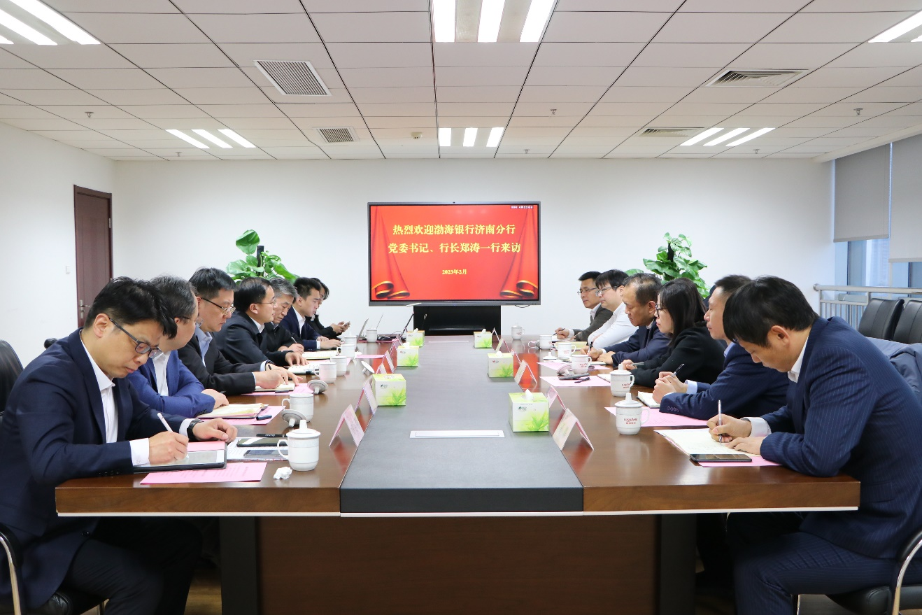2月15日,渤海銀行濟南分行黨委書記、行長鄭濤到訪魯商集團,集團黨委副書記、董事、副總經理朱華建熱情接待。