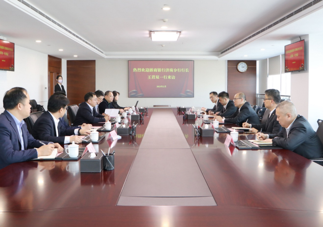 2月27日,浙商銀行濟南分行黨委書記、行長王君雙到訪魯商集團,集團黨委副書記、董事、副總經理朱華建熱情接待并舉行座談。