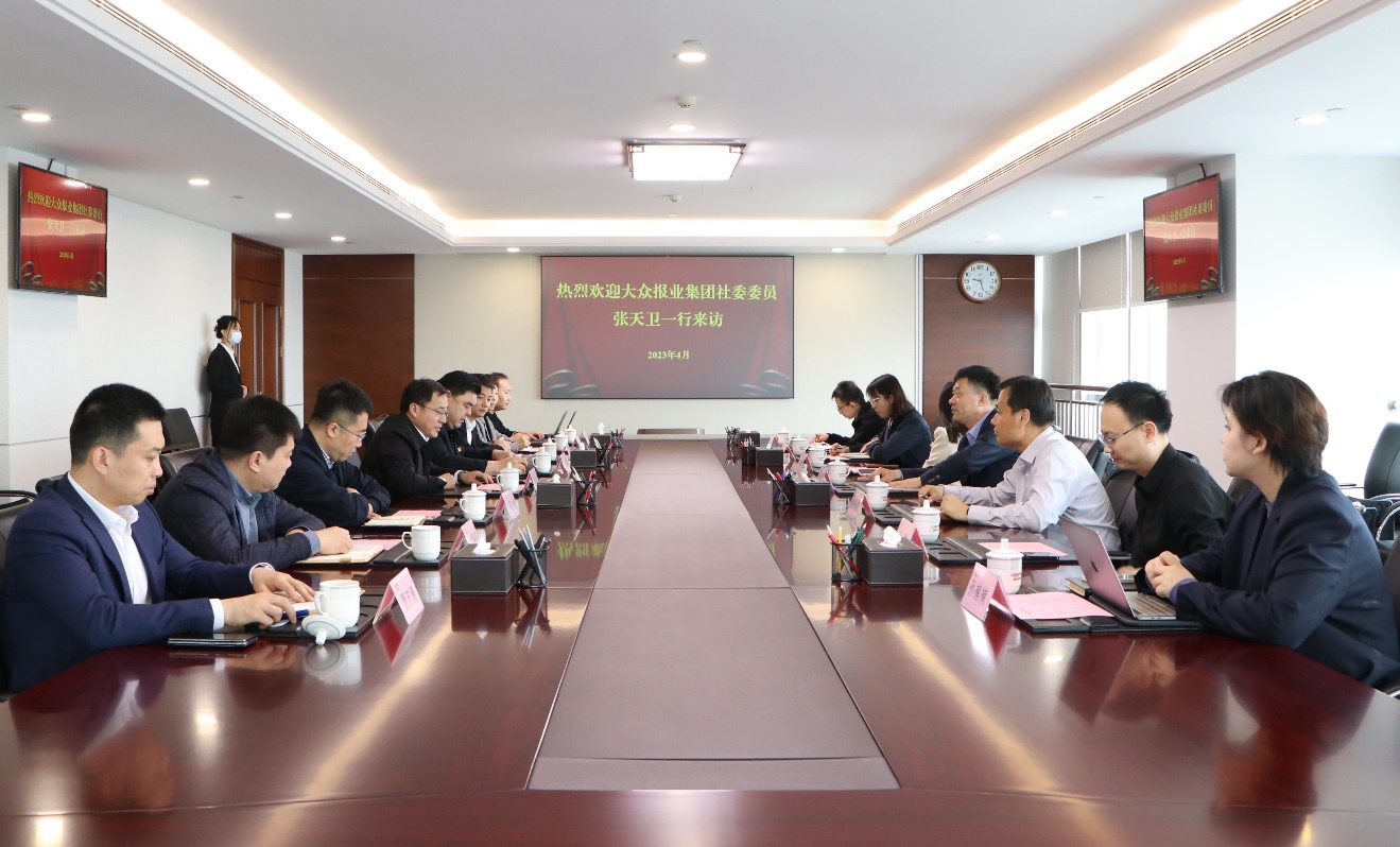 4月3日,大眾報業集團社委委員、齊魯報系黨總支書記、齊魯晚報總經理張天衛到訪魯商集團,集團黨委副書記、董事、副總經理朱華建熱情接待并舉行座談。