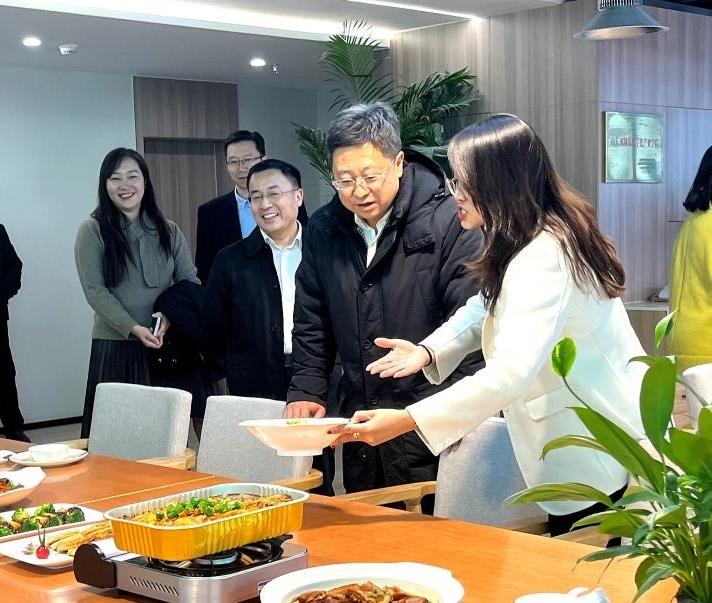 在中國預制菜產業數字大廈,常鐵威詳細了解“中華年菜節”活動籌備、魯商舌尖產品體系布局等情況,并就預制食品產業發展趨勢、就業形勢等進行深入交流。他表示,魯商集團要發揮內部產業協同優勢,將預制菜研發、銷售與種養、生產、流通串聯起來,切實推動山東省食品產業發展,培育更多就業增長點。