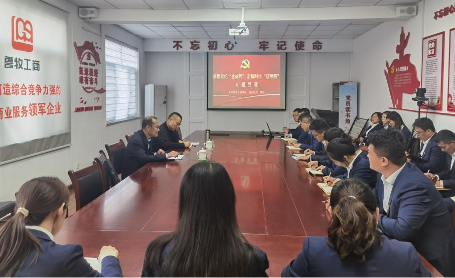 為深入學習貫徹黨的二十屆三中全會精神,10月29日下午,魯商集團黨委宣講團成員,黨委常委、副總經理、總法律顧問賀敬到基層黨建工作聯系點魯商投資牧工商黨支部宣講黨的二十屆三中全會精神。魯商投資黨委書記、董事長兼總經理周雷主持會議。