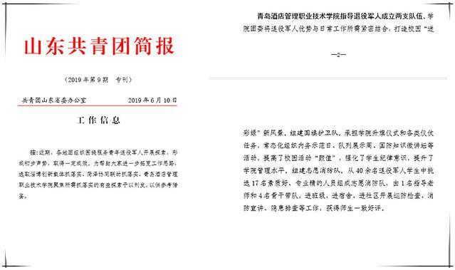 6月10日,“青島酒店管理職院指導(dǎo)退役軍人成立國旗護(hù)衛(wèi)隊(duì)和志愿消防隊(duì)”的消息,作為服務(wù)青年退役軍人典型案例得到《山東共青團(tuán)簡報(bào)》2019年第9期報(bào)道。