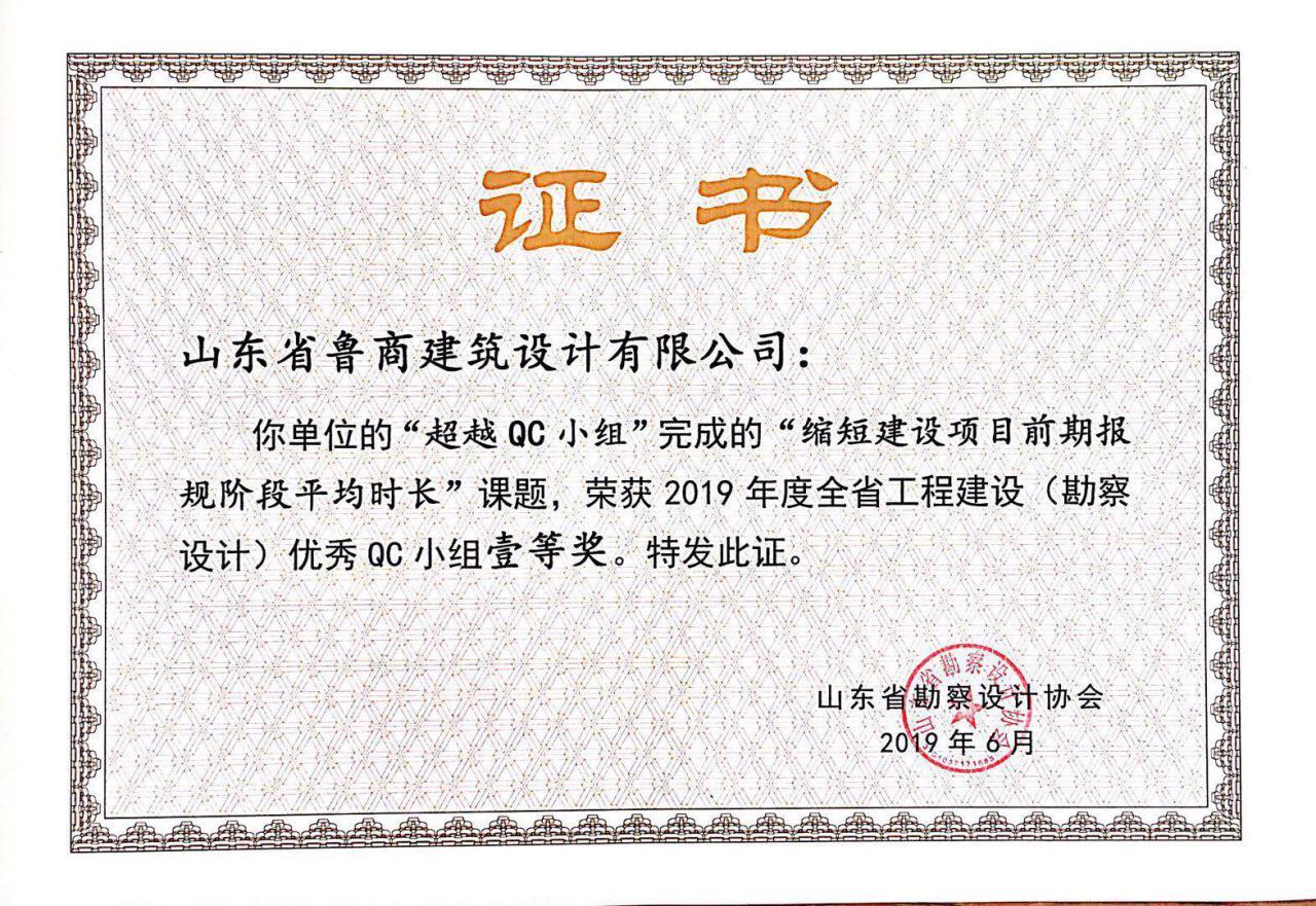 近日,由山東省勘察設計協會組織的2019年度山東省工程建設(勘察設計)優秀QC小組(質量管理小組)評選結果揭曉。經過專家評審,山東省魯商設計有限公司超越QC小組申報的《縮短建設項目前期報規階段平均時長》QC成果在324個申報成果中脫穎而出,獲得2019年度山東省工程建設(勘察設計)優秀QC小組一等獎。