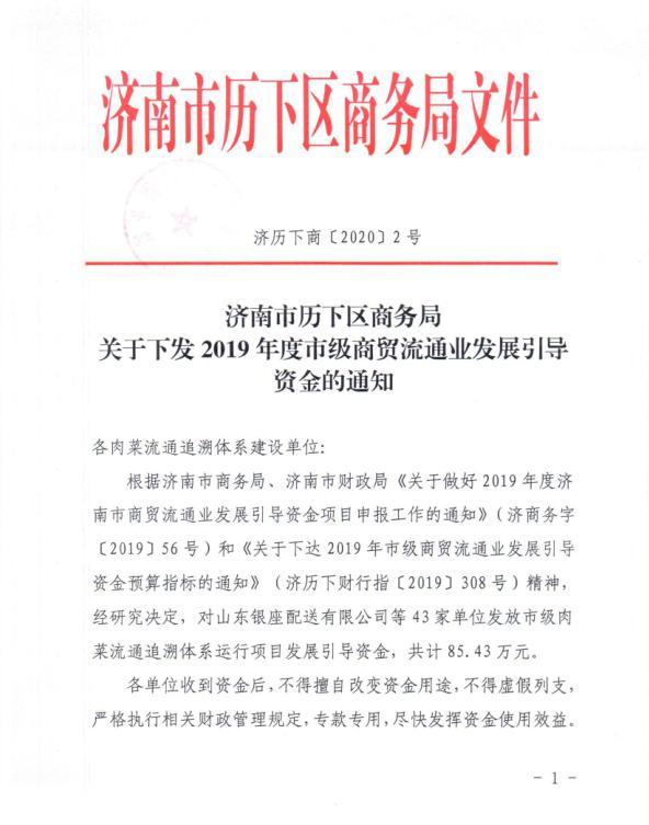 近日,山東銀座配送有限公司在歷下區商務局組織的2019年度《濟南市肉菜流通追溯體系建設》評選中再獲佳績,在43家參評單位中位居第一名,獲得補貼19.09萬元,占補貼總金額的22%。