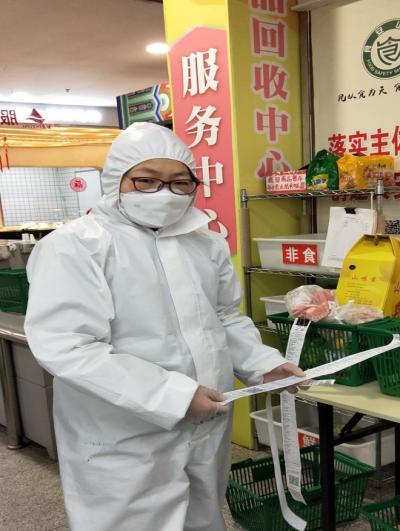 作為工作在零售系統(tǒng)最前沿的收銀員工,因崗位的特殊性,每天要與大量的顧客接觸。為保護好員工,也為保證顧客安全,馬寧四處聯(lián)系購買防護服、口罩、手套、頭套等防護物資,在病毒肆虐的早期,就將收款員進行了從頭到腳的“全副武裝”。在馬寧的帶領下,門店收款區(qū)域堅持每半小時一消毒;她還給每位收銀員都配備了小瓶配置好的酒精,以便隨時消毒;安排每位在崗員工輪流、多次到門外空曠處呼吸新鮮空氣,全力保障員工身心安全。同時,員工吃飯時她來頂崗,客流量大時她加開款臺進行增援。馬寧總能出現(xiàn)在最需要的地方,極大保障了收銀工作的流暢開展。