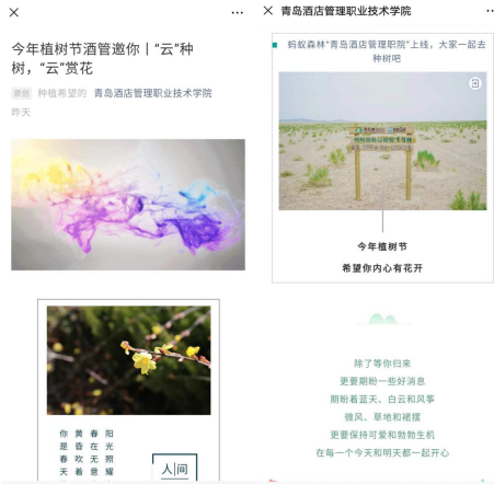 3月12日是第42個植樹節,在抗擊疫情、靜待花開的同時,青島酒店學院邀請學生“云”賞花“云”種樹,一起感受春天、共同播種綠色。