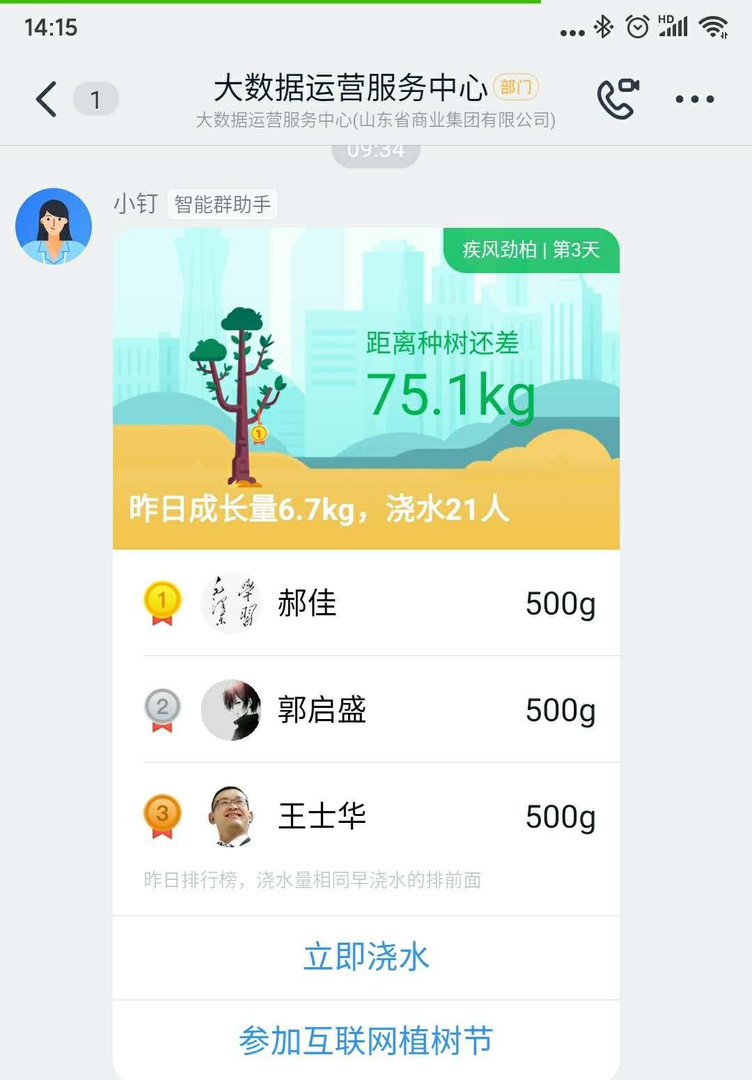 在持續(xù)推動魯商大數(shù)據(jù)平臺項目(代號“疾風”)建設(shè)的同時,集團大數(shù)據(jù)運營服務(wù)中心不忘加強企業(yè)文化建設(shè),近日,中心結(jié)合植樹節(jié)發(fā)起了為期半月的線上公益團建活動,通過釘釘開展網(wǎng)絡(luò)植樹活動——“疾風勁柏”。