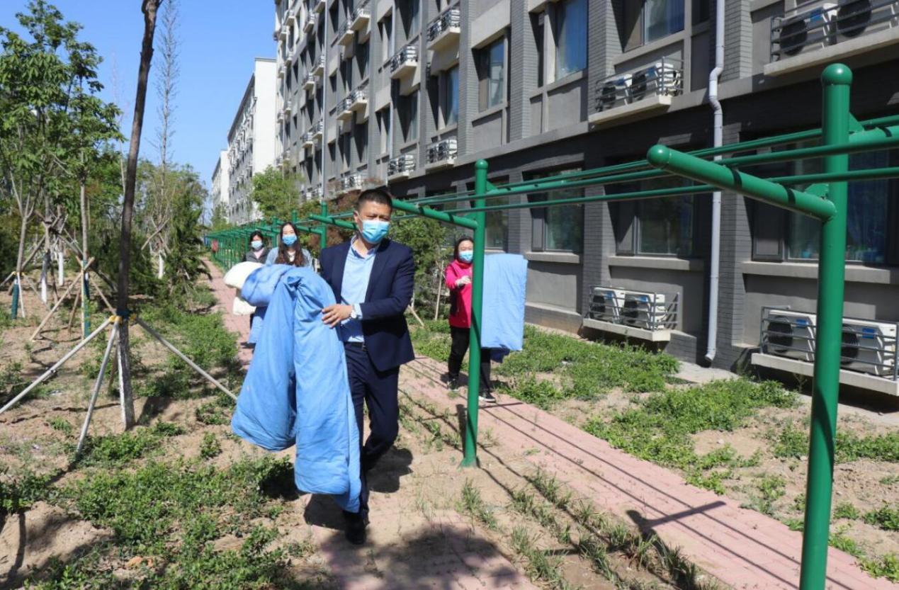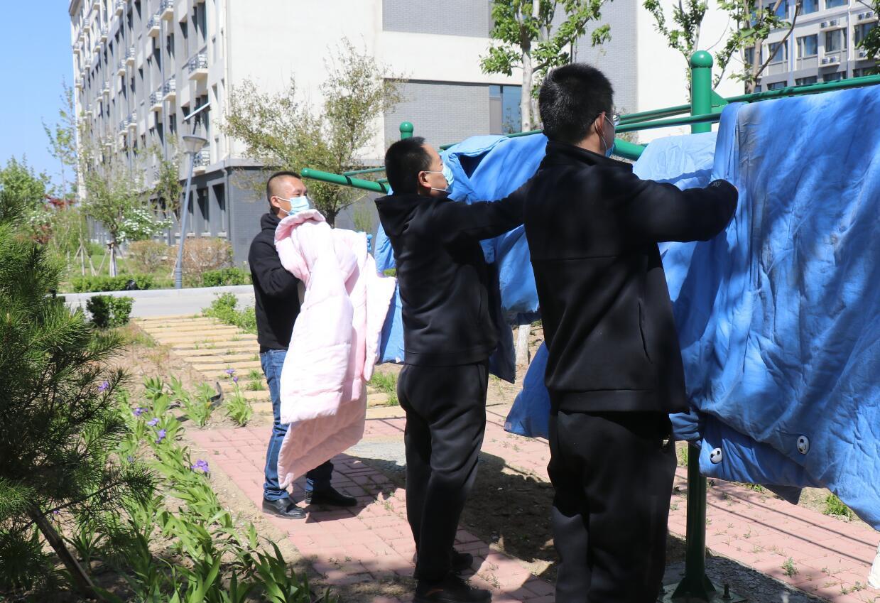 4月20日,團委學(xué)生處會同二級學(xué)院向同學(xué)們發(fā)出需求征集信息,學(xué)生通過班級群反饋需求,輔導(dǎo)員逐一記錄。4月22日,風(fēng)輕云淡,陽光正好,70余名老師樓上樓下開始忙碌,把學(xué)生被褥抱出宿舍,一件件晾曬在公共晾衣桿上。夕陽西下時,按照標識再一件一件抱回宿舍。