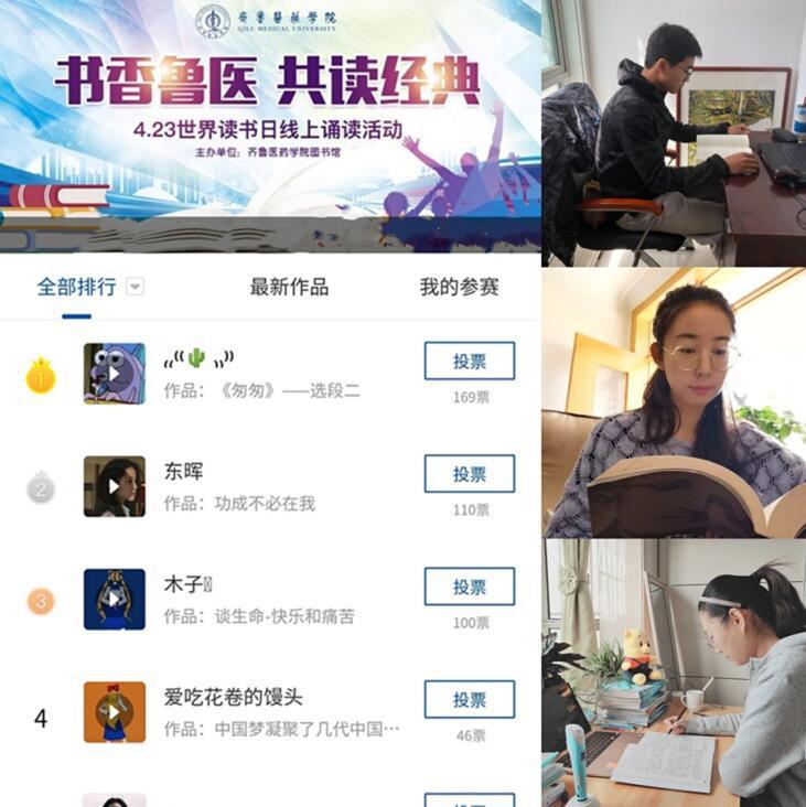 為響應(yīng)集團(tuán)“新時代·新使命·新愿景”讀書活動號召,充分發(fā)揮圖書館職能,大力營造全員閱讀的濃厚氛圍,在4月23日“世界讀書日”來臨之際,齊魯醫(yī)藥學(xué)院圖書館開展“書香魯醫(yī),共讀經(jīng)典”線上誦讀活動,與廣大師生“云”讀書,共沐書香。