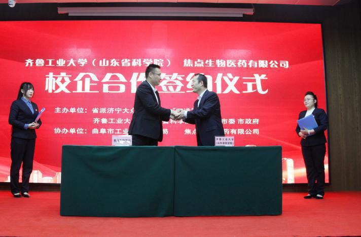 活動現場,齊魯工業大學(山東省科學院)與焦點生物總經理劉磊,副總經理、焦點醫藥有限公司總經理李慶分別簽署科研合作協議和大學生就業實習與創業教育基地合作協議。