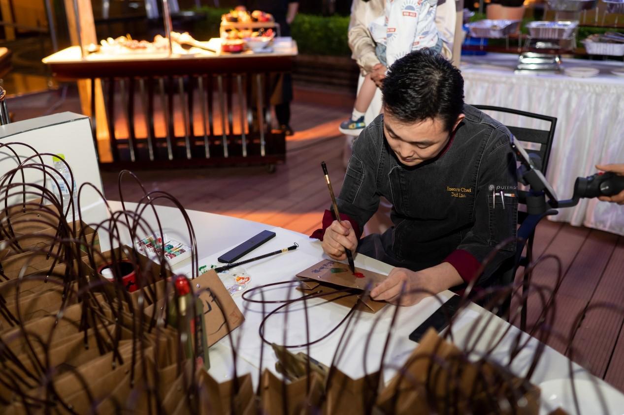 “大家好,此次作品為三份手寫菜單,5.21元起拍,競拍開始!”臨沂魯商鉑爾曼行政總廚劉國安將書法與菜單相結合,富有藝術氣息。現場以及手機端的粉絲興趣濃厚,紛紛舉牌,最終三款產品以556元成交。隨后,劉廚變身畫師,在手提袋上畫滿了寓意美好的白菜、櫻桃等,客人購買后可將手提袋裝滿粽子并帶走,現場收入近2000元。