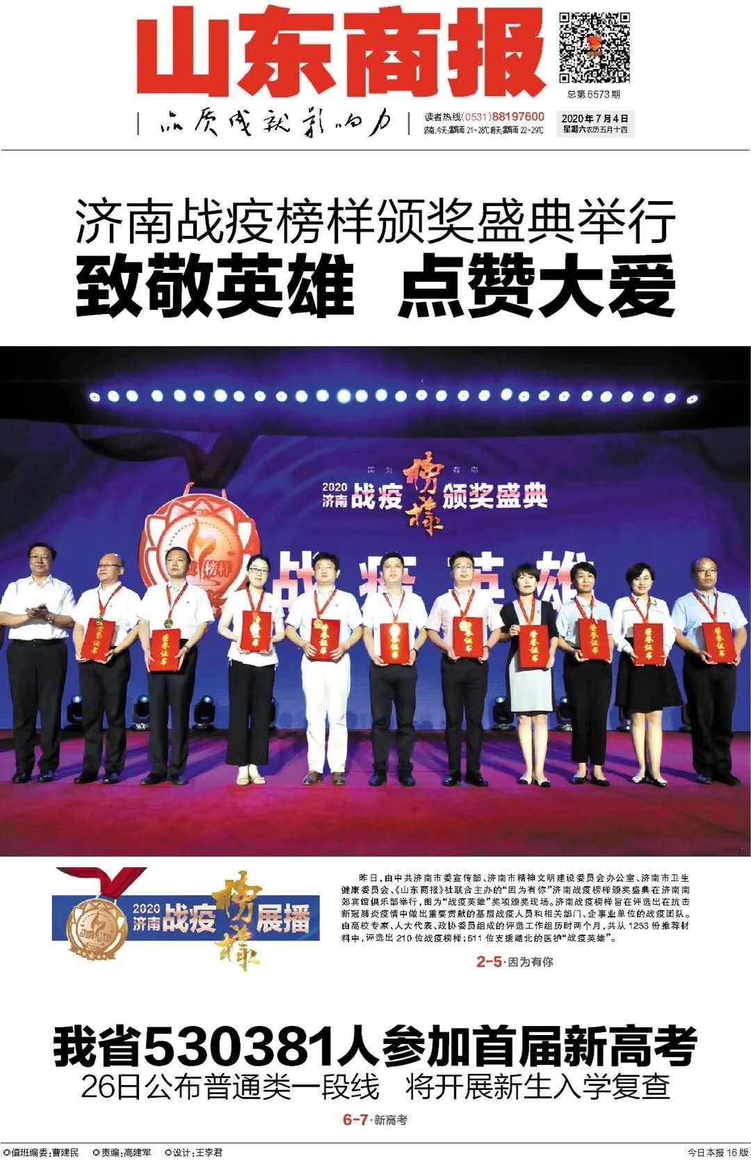 魯商傳媒總經理、總編輯龐道鋒代表《山東商報》社在致辭中說,作為扎根濟南、輻射全省的主流都市類媒體,山東商報一直秉承“因為我愛這座城市”的情懷,把熱愛濟南作為本分,更作為天職。這些年,我們也一直在與這座城市同頻共振,積極傳播榜樣文化,弘揚社會正氣。自2015年開始,山東商報聯合濟南市委宣傳部、濟南市文明辦,在主流媒體中首創“濟南榜樣”品牌,并連續五年開展“濟南榜樣”評選活動。在今年這樣一個特殊的時期,正能量濟南涌現出了一批“戰疫”先進典型,為傳承榜樣力量、致敬戰疫英雄,濟南市委宣傳部、濟南市文明辦、濟南市衛健委、《山東商報》社共同舉辦了這次戰疫榜樣評選,以激勵大家不忘初心、牢記使命。