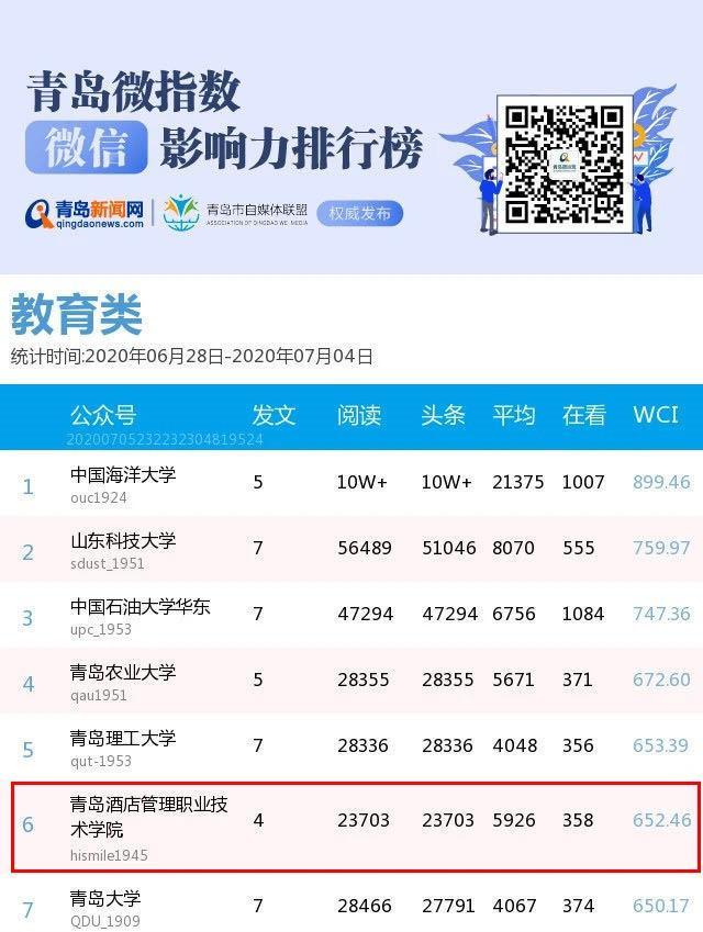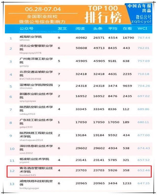 7月6日,中國青年報發(fā)布“全國普通高校微信公號排行榜(6.28-7.4)”,青島酒店學(xué)院官方微信公眾號“青島酒店管理職業(yè)技術(shù)學(xué)院(hismile1945)”綜合影響力入圍全國職業(yè)院校第12位,4篇推文全部進入全國職業(yè)院校單周文章閱讀量TOP100排行榜。