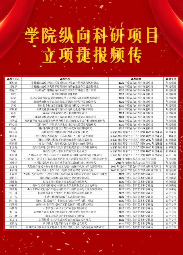 暑假期間,青島酒店學(xué)院縱向課題立項(xiàng)捷報(bào)頻傳,近期共獲得課題立項(xiàng)62項(xiàng)。其中,獲得青島市社科規(guī)劃項(xiàng)目13項(xiàng),山東省教育科學(xué)“十三五”規(guī)劃2020年度課題7項(xiàng),山東省社科聯(lián)人文社會科學(xué)課題2項(xiàng),山東省社科聯(lián)社會科學(xué)普及應(yīng)用研究項(xiàng)目2項(xiàng),山東省藝術(shù)科學(xué)重點(diǎn)課題15項(xiàng)。另外,學(xué)院還獲得山東省旅游職業(yè)教育專業(yè)建設(shè)指導(dǎo)委員會2020年度規(guī)劃課題立項(xiàng)20項(xiàng)、山東軟科學(xué)研究會“產(chǎn)教融合研究智庫專項(xiàng)”2020年度課題3項(xiàng)。
