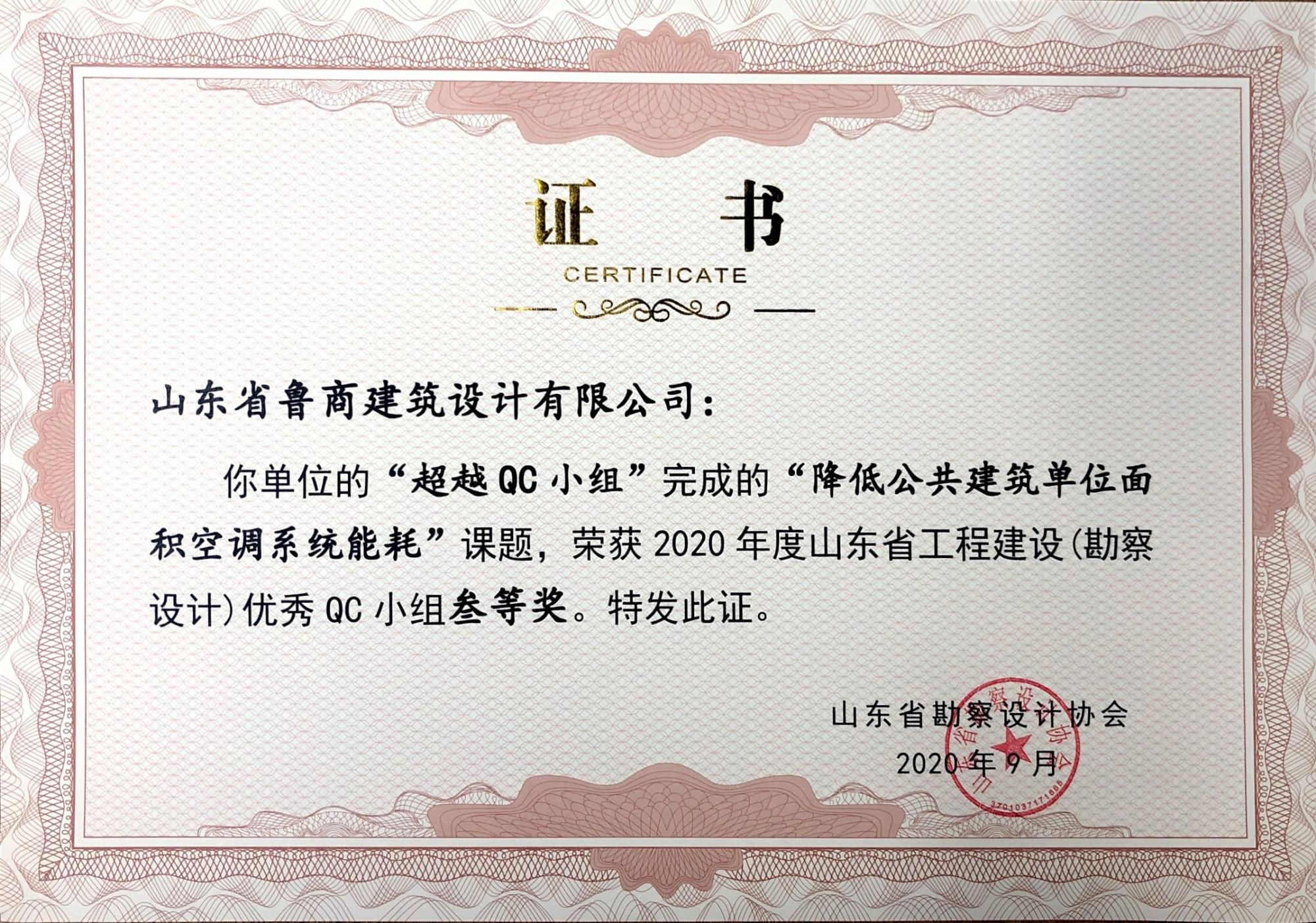 近日,由山東省勘察設(shè)計(jì)協(xié)會(huì)組織評(píng)選的2020年度山東省工程建設(shè)(勘察設(shè)計(jì))優(yōu)秀QC小組獲獎(jiǎng)情況揭曉。經(jīng)過(guò)專家評(píng)審,由魯商發(fā)展所屬山東省魯商設(shè)計(jì)有限公司(簡(jiǎn)稱魯商設(shè)計(jì)院)超越QC小組申報(bào)的《降低公共建筑空調(diào)系統(tǒng)能耗》QC成果在404個(gè)申報(bào)成果中脫穎而出,獲得2020年度山東省工程建設(shè)(勘察設(shè)計(jì))優(yōu)秀QC小組三等獎(jiǎng)。