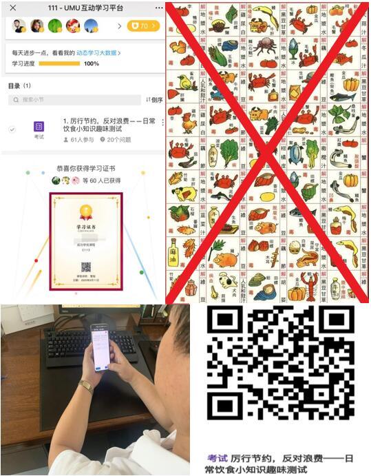 投資公司利用飯后時間突擊建立“厲行節約·反對浪費——日常飲食小知識趣味測試”微信群組,并在群內展示了測試小程序二維碼,邀請大家即時手機掃碼參與。參與答題的同事們熱情高漲,紛紛表示這種答題方式既能寓教于樂,讓死板的知識動起來,又能發現因以往錯誤認知而產生的食物浪費。