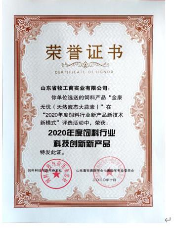 近日,由牧工商總代理并選送的飼料產(chǎn)品“金康無憂(天然液態(tài)大蒜素)”在“2020年度飼料行業(yè)新產(chǎn)品新技術新模式”評選活動中,榮獲“科技創(chuàng)新新產(chǎn)品”稱號。