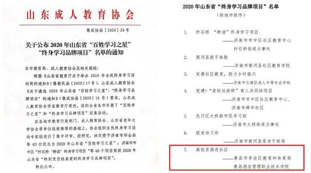 日前,根據《山東省教育廳關于舉辦2020年全民終身學習活動周的通知》要求,山東省成人協會組織公布了2020年省“百姓學習之星”和40個“終身學習品牌項目”名單,青島酒店學院與青島市李滄區教育和體育局聯合申報的“高校資源進社區”社區教育項目入選2020年山東省“終身學習品牌項目”。