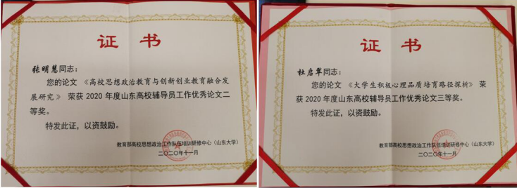 齊魯醫(yī)藥學院張明慧老師的論文《高校思想政治教育與創(chuàng)新創(chuàng)業(yè)教育融合發(fā)展研究》獲得二等獎,杜啟翠老師的論文《大學生積極心理品質培育路徑探析》獲得三等獎。