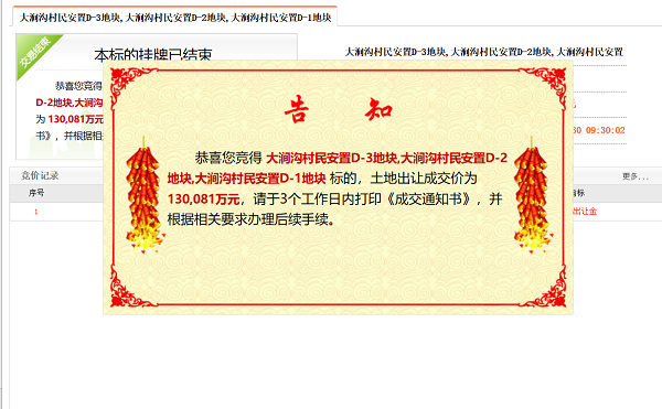 11月30日,魯商發展通過濟南公共資源網交易系統成功競得宗地名稱為大澗溝村民安置D-1地塊、D-2地塊和D-3地塊國有建設用地使用權,成交總價款為130081萬元,本次競買事項在公司董事會授權經理層的范圍內。