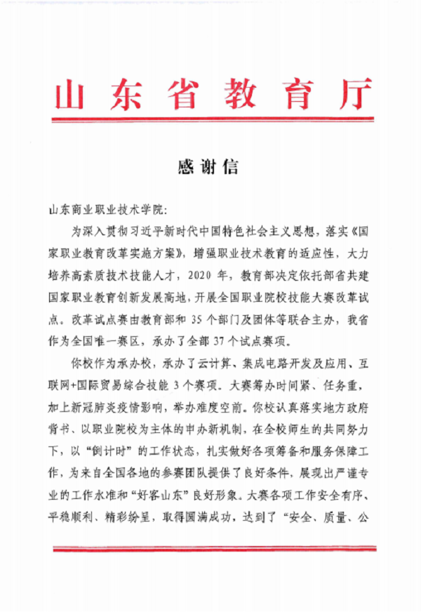 近日,省教育廳給山東商院發(fā)來感謝信,對(duì)學(xué)校在承辦全國(guó)職業(yè)院校技能大賽改革試點(diǎn)賽中作出的貢獻(xiàn)予以肯定,向?qū)W校及師生表示衷心的感謝。