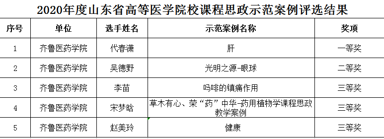 2月1日,根據山東省高等醫學教育研究中心《關于公布2020年度山東省高等醫學院校課程思政示范案例評選結果的通知》,齊魯醫藥學院申報的5項案例均獲得獎項,其中一等獎1項,二等獎1項,三等獎3項。