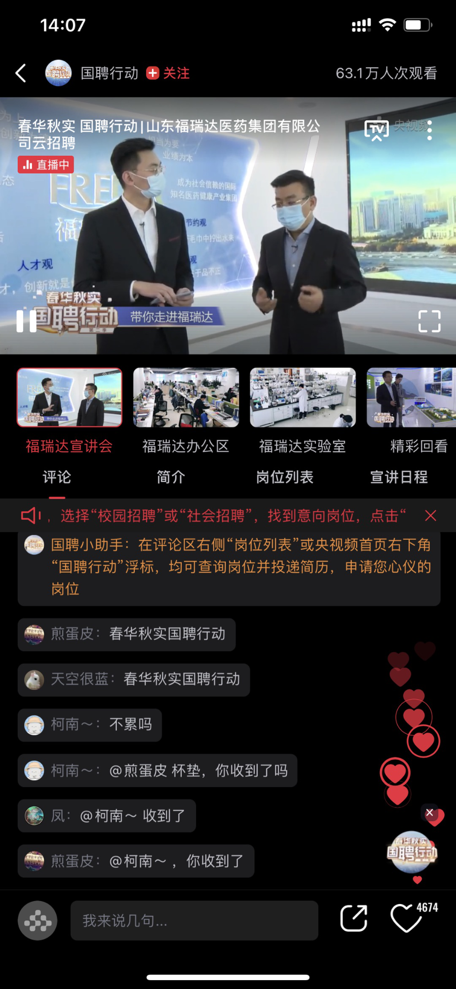 此次“國聘行動”福瑞達招聘專場直播持續1小時45分鐘,互動評論18630條,網上累計觀看突破550萬人次,引發在校大學生、各方面人才持續關注、積極參與,反響熱烈。