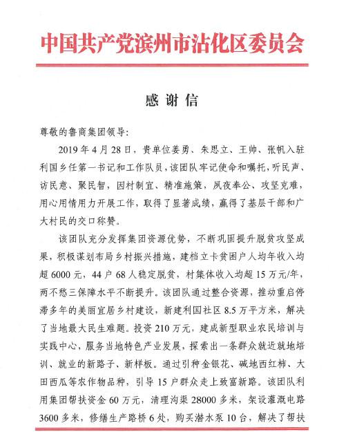近日,集團(tuán)收到濱州市沾化區(qū)委區(qū)政府發(fā)來的感謝信,感謝集團(tuán)選派的“第一書記”兩年來扎根一線、攻堅(jiān)克難,幫助和支持沾化經(jīng)濟(jì)和社會(huì)發(fā)展作出的實(shí)績和貢獻(xiàn)。