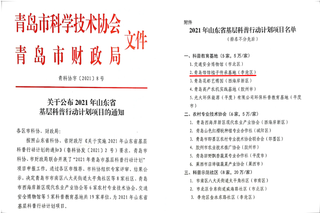 近日,青島市科協(xié)、市財(cái)政局聯(lián)合下發(fā)《關(guān)于公布2021年山東省基層科普行動計(jì)劃項(xiàng)目的通知》(青科協(xié)字〔2021〕8號),青島酒店學(xué)院餑餑榼子傳承基地順利入選。