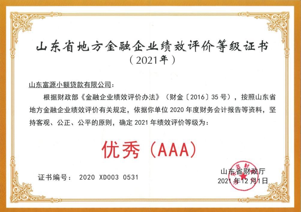 近日,省財政廳頒發2021年山東省金融企業績效評價等級證書,富源小貸獲得“AAA”優秀等級。評價結果表示,其績效狀況在全國其他類金融企業中處于優秀水平。至此公司已連續3年獲此最高評價。