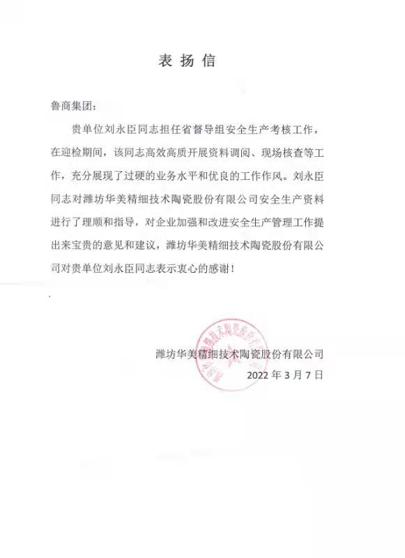 3月7日,濰坊市坊子區(qū)坊城街道辦及濰坊華美精細(xì)技術(shù)陶瓷股份有限公司向魯商服務(wù)發(fā)來表揚(yáng)信,表彰公司項(xiàng)目服務(wù)事業(yè)部員工劉永臣在省安全生產(chǎn)專項(xiàng)督導(dǎo)工作組駐濰坊坊子區(qū)督導(dǎo)工作期間,工作勤懇、表現(xiàn)出色,為當(dāng)?shù)卣捌髽I(yè)解決了一系列困難。