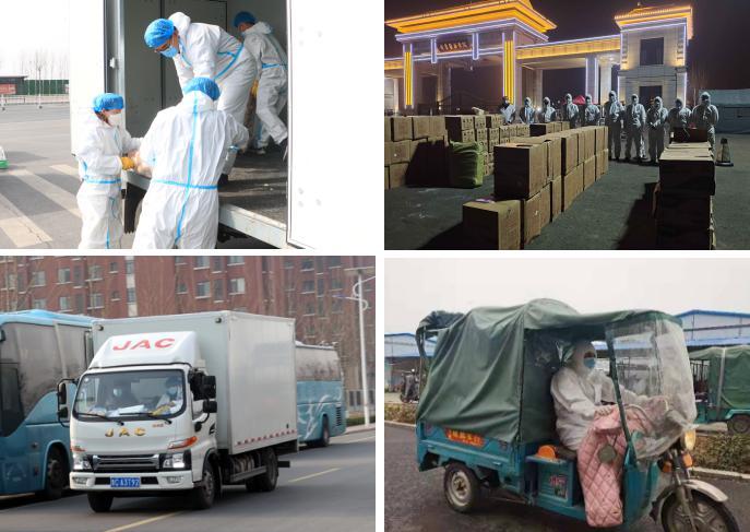 學院專人對供應物資外包裝進行集中消殺,后勤人員和教職工志愿者規范穿戴防護服迅速到達現場,有序裝車,運進校園。由于校內沒有大型運輸工具,只能用小型貨車、三輪車、小拖車,組成臨時“運輸小分隊”,各類車輛往返校門口與食堂400多次,運輸小分隊每人每天平均工作13.5小時,用雙腳打通食材供應的“最后一公里”。