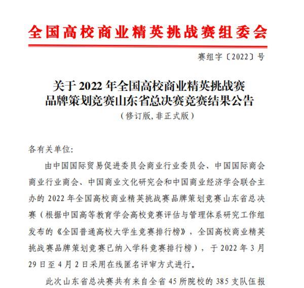 4月4日,2022年全國高校商業(yè)精英挑戰(zhàn)賽品牌策劃競賽山東省總決賽結束,山東商院9支隊伍在全省385支隊伍中脫穎而出,獲一等獎4項、二等獎4項,三等獎1項,學院獲最佳院校組織獎。