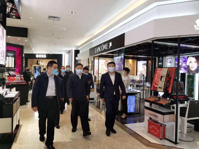 4月13日,臨沂市副市長、市公安局局長任澤龍一行到銀座集團臨沂商城店督導防疫保供工作,臨沂商城店總經理李振湖陪同。