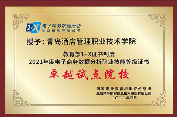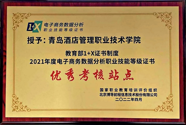 近日,在2021年度電子商務(wù)數(shù)據(jù)分析“1+X”證書試點(diǎn)工作表彰會(huì)暨崗課賽證融通育人模式線上研討會(huì)上,青島酒店學(xué)院榮獲“1+X”電子商務(wù)數(shù)據(jù)分析職業(yè)技能等級(jí)證書“卓越試點(diǎn)院校”和“優(yōu)秀考核站點(diǎn)”2項(xiàng)榮譽(yù)。