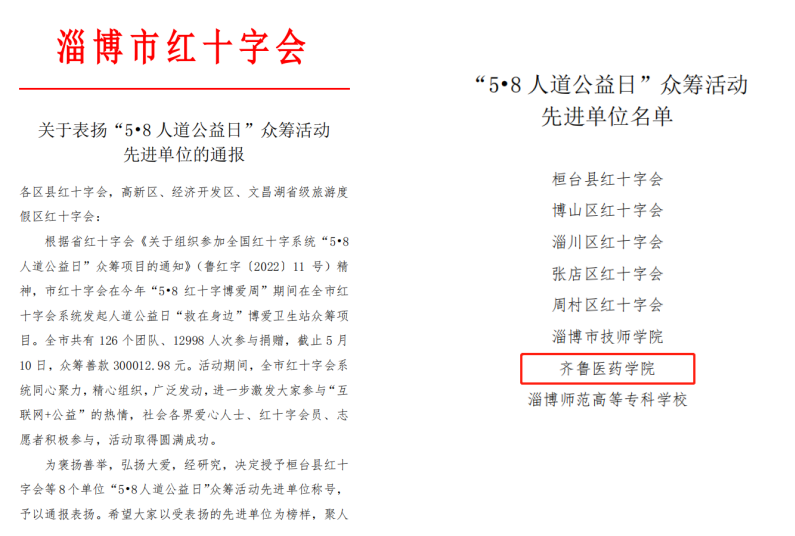 近日,齊魯醫(yī)藥學院在淄博市紅十字會“5?8 紅十字博愛周”期間,積極宣傳、廣泛發(fā)動,師生們熱情參與、奉獻愛心,被授予“5?8 人道公益日”眾籌活動先進單位稱號。