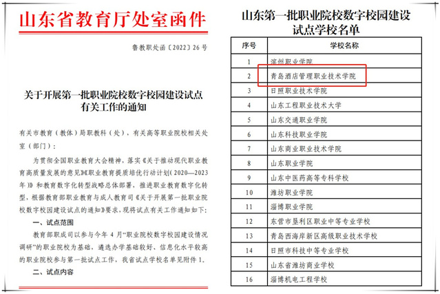 近日,省教育廳發(fā)布通知,青島酒店學院入選第一批職業(yè)院校數(shù)字校園建設試點單位。