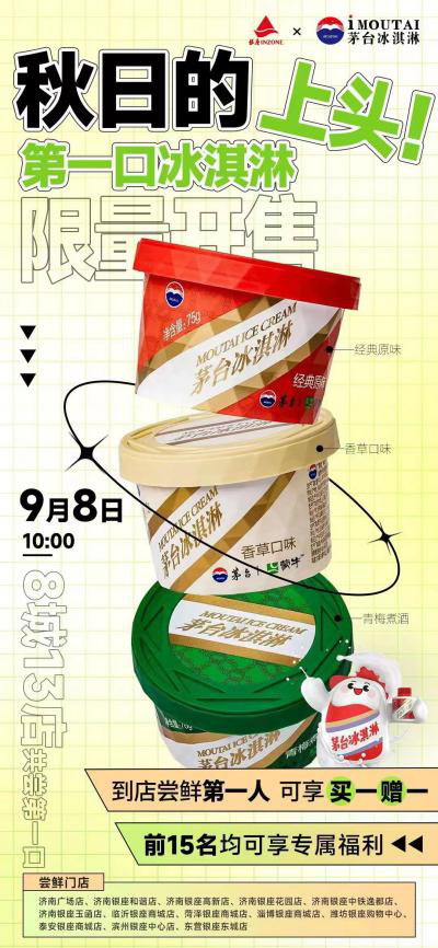 此外,節(jié)日前夕,銀座集團(tuán)與茅臺(tái)集團(tuán)強(qiáng)強(qiáng)聯(lián)合,于9月8日在13家門店同步發(fā)售茅臺(tái)冰激凌,并為會(huì)員提供專項(xiàng)特權(quán),秋日限定美味為闔家歡聚時(shí)刻提供一口醇香的同時(shí),也為傳統(tǒng)佳節(jié)增添更多喜悅。