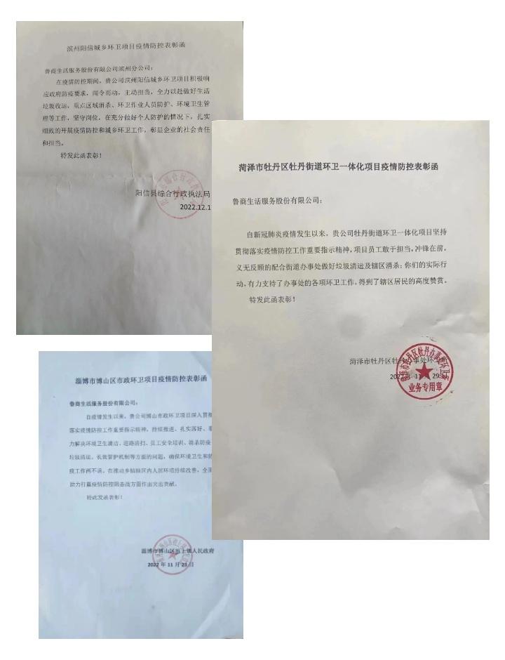 類似的事情,近期在魯商服務各項目時有發生。北京藍岸麗舍項目服務中心陸續收到當地街道辦及社區業主送來的感謝信,對項目在應對疫情時作出的迅速反應和有效措施予以感謝和表揚。淄博博山城鄉環衛一體化項目服務中心所服務的池上鎮、源泉鎮也發來表彰函,對項目在疫情防控工作中的突出表現給予表彰。