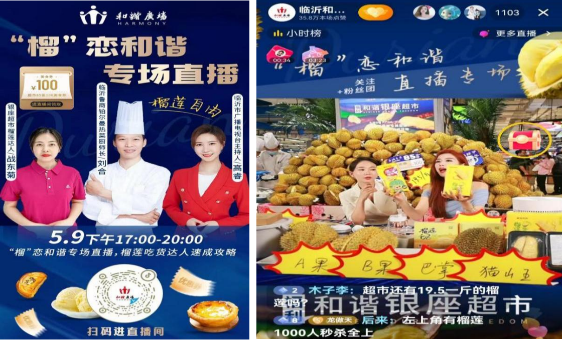 憑借前期積累的優秀口碑,5月9日,臨沂和諧店以“榴戀和諧 品鑒美食”為主題,聯合臨沂鉑爾曼大酒店及網紅達人圍繞榴蓮品種分類、等級挑選、相關美食制作等開啟直播,直播當天,線上團券銷售30.71萬元,直播間曝光38.38萬人次。