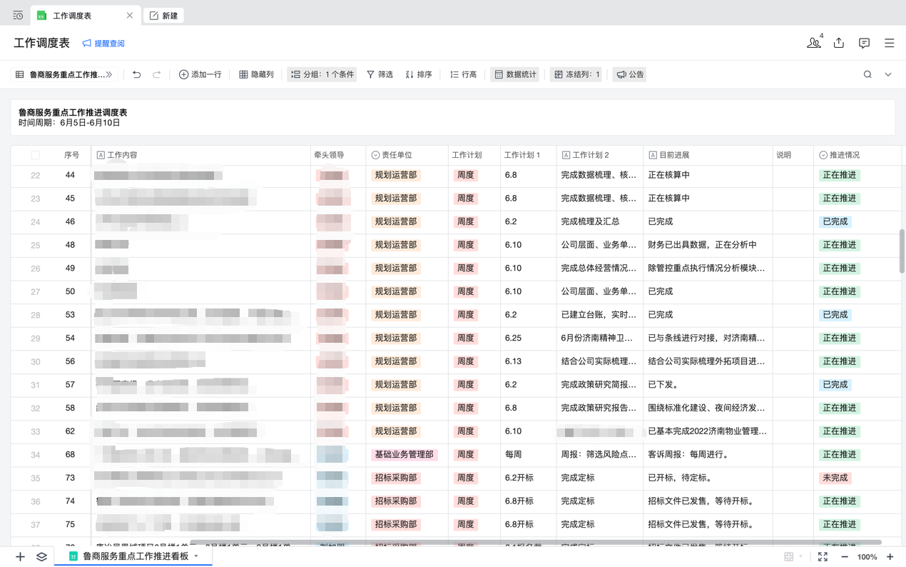 公司通過“企業微信智能圖表”,創建《調度事項視圖看板》,形成“實時督導”,隨時查看工作進度,實時調度工作協同,工作完成及時銷項,實現常態調度、專項調度高效結合,確保工作責任明晰、節點明確、推進有力、見行見效。截至5月底,梳理重點、難點工作事項臺賬122項,公司周調度事項銷項率達100%,月銷項率達92%。